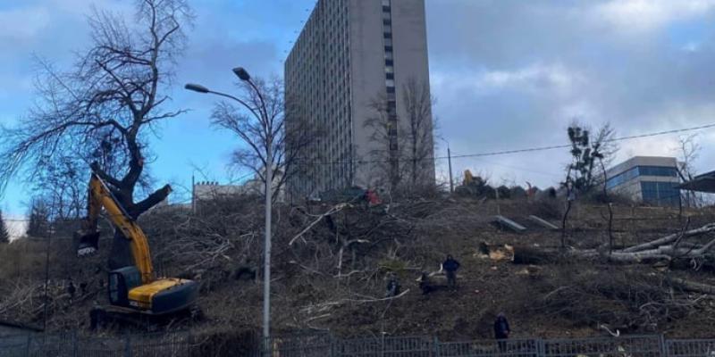В Киеве фирма “Лота-МНВ”, зачищая участок под строительство элитного 29-этажного ЖК, вырубила деревья на склоне Черепановой горы (ул. Госпитальная,4). А для того, чтобы неравнодушные киевляне не смогли помешать строительной технике, фирма выставила несколько десятков “титушек”.